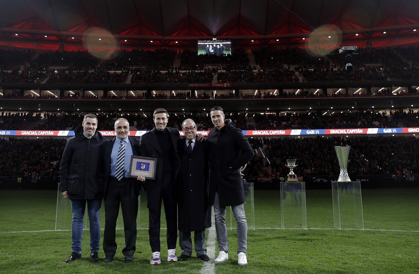 Después de emotivos actos protagonizados por los actuales capitanes de la plantilla (Godín, Koke, Griezmann y Juanfran) y las peñas, llegó el turno de quienes en el pasado lucieron el brazalete del Atlético, esto es, Adelardo, Tomás Reñones, Antonio López y Fernando Torres. El ‘9’ fue quien tomó la palabra para transmitir a Gabi un emotivo mensaje de homenaje.