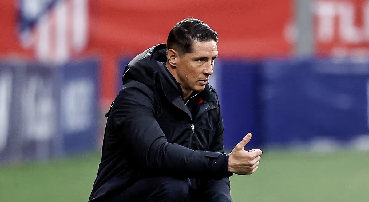Fernando Torres dirige al filial durante un encuentro de Primera RFEF (X: @AtletiAcademia))