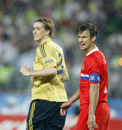 Torres protagonizó la primera ocasión para España. David Villa acercó el cuero al área, Torres lo pescó y ejecutó a la media vuelta un disparo iba que despejó Akinfeev. Ambas selecciones se cedían el testigo de la iniciativa, si bien la de Luís Aragonés movía el juego con mejor criterio y cuando llegaba lo hacía con peligro, como demostró Villa con un disparo lejano. Rusia estaba a merced del rival y sólo pudo inquietar a Iker a balón parado. Puyol y Marchena formaban un muro infranqueable para la ‘troika’ ofensiva roja Semshov-Pavlyuchenko-Arshavin.