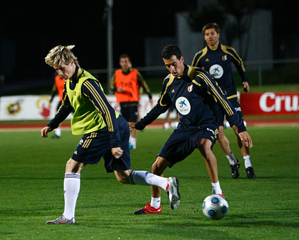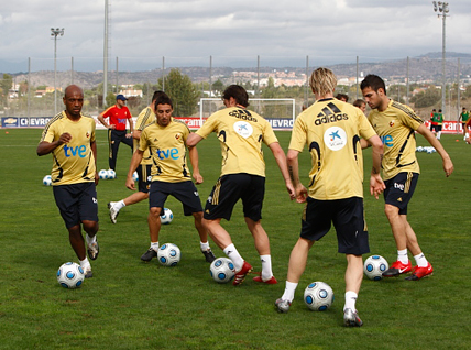 Previamente el entrenamiento del martes consistió en poco más de una hora de trabajo, en la que los futbolistas disputaron un partidillo en tres cuartos de campo con ejercicios de posesión de balón y presión. Fernando Torres militó juntó a Reina, Iraola, Puyol, Marchena, Monreal, Busquets, Xavi, Cazorla, Mata y Cesc La anécdota de la tarde la protagonizó Borja, delantero atlético de la Sub-17, quien fue requerido por Del Bosque para poder configurar dos equipos de 11 jugadores.