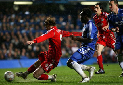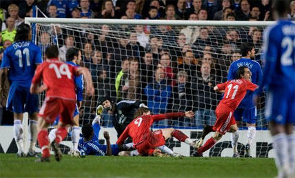 Chelsea looked to have restored their advantage when Michael Essien struck home just seconds after a phenomenal tackle by Jamie Carragher to stop Drogba. 'GOAL' read the Stamford Bridge scoreboard. But no. The linesman's flag was up.