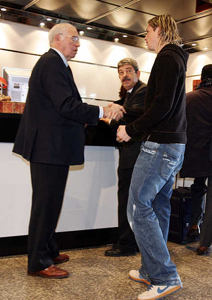 Torres saluda a Luis Aragonés a su llegada a la jornada de convivencia de la Selección en Barajas, Madrid (12-12-2005) Foto: J.A. Sirvent