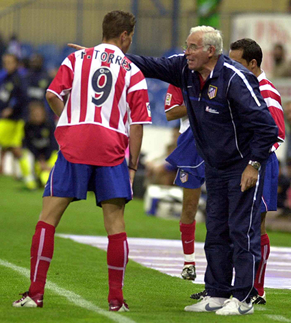 Luis Aragonés da unas indicaciones a Torres en el Calderón ante el Chievo Verona (27-08-2002) Foto: J.A. Sirvent