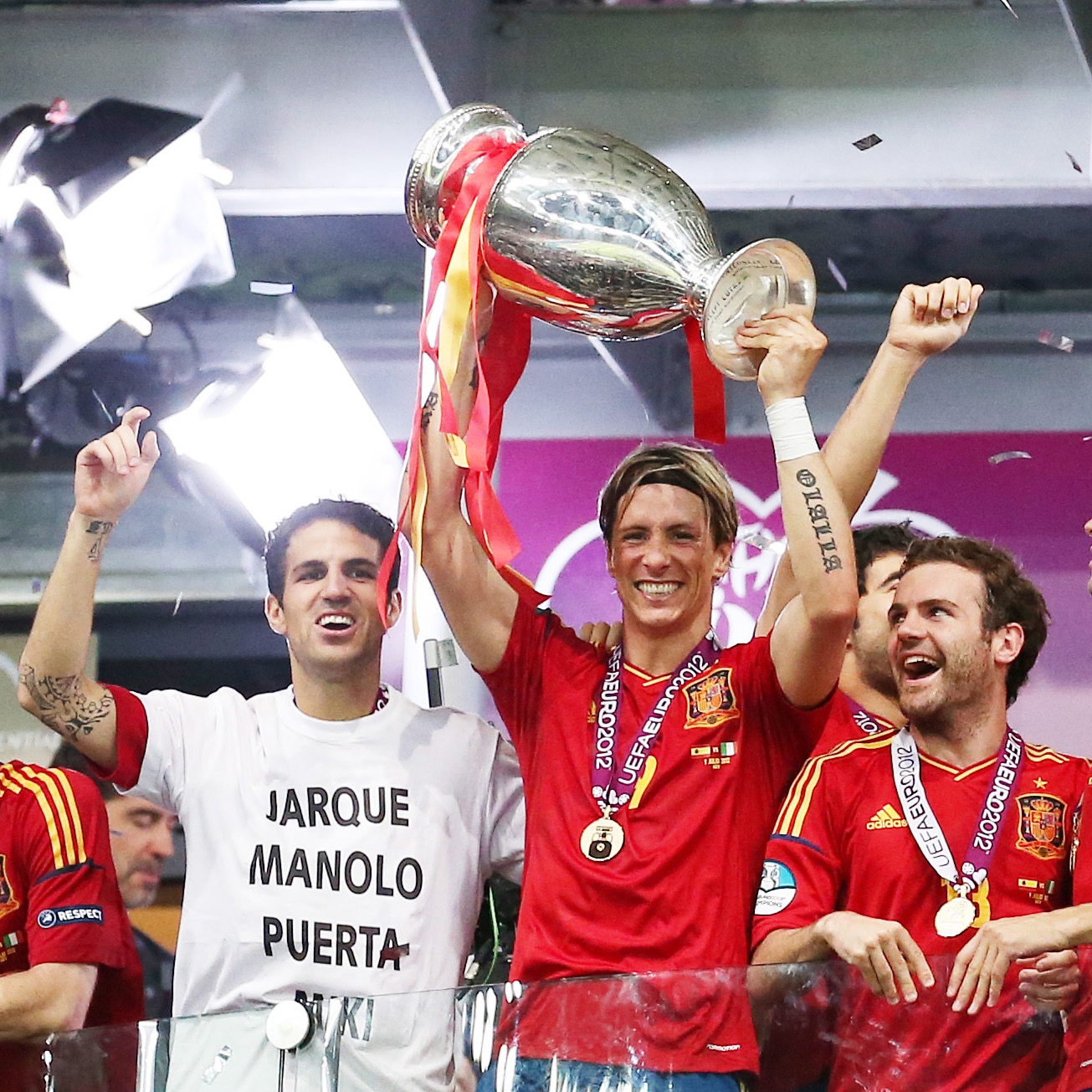 Y aún quedaba más. Tuve la oportunidad de defender a España por tercera ocasión en una Eurocopa, la de Polonia-Ucrania. Acudimos a la cita a defender el título que conseguimos cuatro años atrás en Viena y, una vez más, logramos llegar a la final con mucho esfuerzo, después de superar a Francia y Portugal en cuartos y semifinales, nos encontramos con Italia en la final de Kiev. Jugamos un gran partido y logramos un resultado irrepetible, un 4-0 en el que conseguí marcar el tercero. Además del título, logré la Bota de Oro como máximo goleador del torneo. Me enteré en la celebración con mis hijos porque lo pusieron en el vídeo marcador. El coeficiente me hacía ganador. ¿Se puede pedir más?