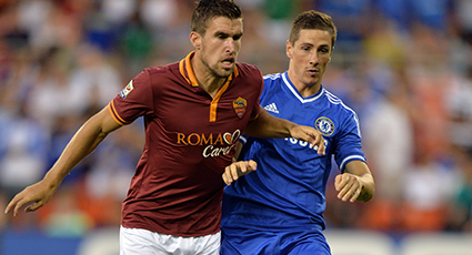 Franceso Totti's deep ball into the box fell to Lamela but Michael Essien was in quickly to dispossess the midfielder, releasing Andre Schurrle down the Chelsea left. His cross-field pass was perfectly weighted for Fernando Torres, whose volleyed knock-down found Essien ready to shoot on the edge of the Roma box, his low drive tipped away by goalkeeper De Sanctis.