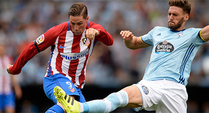 El ritmo vibrante se adueñó del partido desde el primer instante. Y fue a más. Antes de cumplirse los diez minutos de juego avisó el Celta con la llegada de por la derecha de Señé que acabó estrellando en el lateral de la red. El Atlético no se quedaba atrás y buscó responder con fútbol vertiginoso, apoyado en la velocidad de juego que siempre imprime Carrasco por el carril. Griezmann abrió el turno del Atlético cuando disparó con la derecha desde la frontal, a las manos de Sergio. Le siguió un buen centro de Carrasco, desde la izquierda, al que no llegó Torres por muy poco.