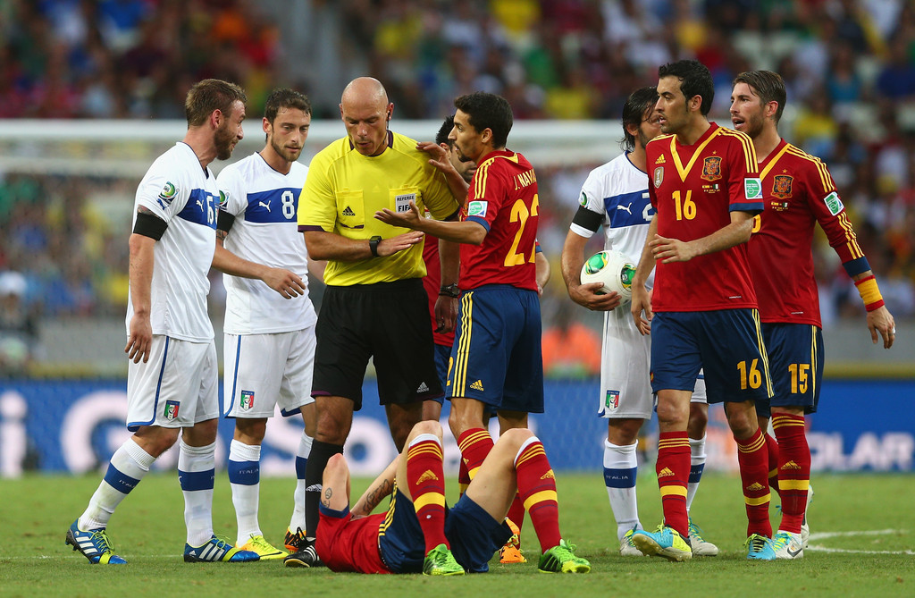 El último precedente fue la tanda del Prater vienés en la Eurocopa de Austria-Suiza, cuando España se impuso con el definitivo de Cesc y dos intervenciones de mérito de Casillas. Italia lanzó primero con el gol a lo Panenka de Candreva, mientras que Xavi empató sin dudar. Aquilani cumplió con su lanzamiento, al igual que Iniesta. De Rossi tampoco erró en el tercero y Piqué correspondió. Giovinco transformó el 4-3 con un baile previo a su lanzamiento pegado al palo izquierdo, mientras que Ramos volvió a empatar a 4-4. Pirlo tiró con su acostumbrada calidad, paradina incluida y Mata volvió a anularlo con 5-5. Pleno en ambos equipos para pasar a la fase del K.O. Montolivo cumplió con su parte y Busquets también ajustando al palo derecho. El central Bonucci fue quien acabó por errar su turno y Jesús Navas se ocupó del definitivo sin lugar a error. Explosión de júbilo en Fortaleza cuando el palaciego confirmó que España disputará el título en la gran final de Maracaná ante Brasil.
