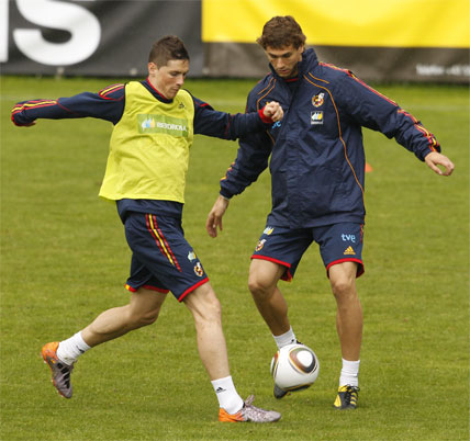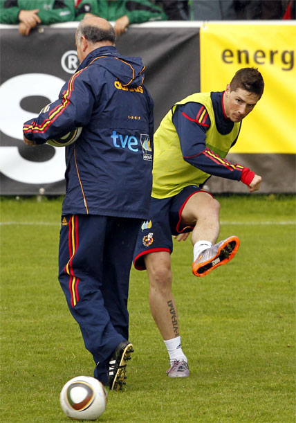 Por la tarde llegó el turno de trabajo. Vicente del Bosque dirigió su última sesión preparatoria en las instalaciones de Schruns-Tschagguns. La Selección trabajó una vez más bajo la lluvia que la ha acompañado desde que llegara el domingo pasado al valle de Montafon. En el plan de trabajo una vez más el esférico fue el gran protagonista. Una serie de rondos, un partidillo sin porteros y como guinda un intenso partidillo a medio campo. Fernando Torres compartió equipo con Puyol, Piqué, Xabi Alonso, Arbeloa, Busquets, Xavi, Silva, Pedro y Villa.