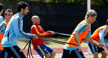 El primer entrenamiento ocupó una hora y cuarto de la mañana. A las once los internacionales saltaron al césped para ejercitarse bajo las órdenes de Vicente del Bosque y comenzaron con los preceptivos ejercicios de calentamiento. Después entró en escena el balón, amigo imprescindible en los entrenamientos de La Roja. En primer lugar ejercicios de toque y posesión para dar paso al trabajo en grupos, con rondos y trabajo físico como menú diferenciado. Por último, el partidillo de entrenamiento en el que los jugadores se emplearon a fondo. Para la tarde está prevista una segunda sesión de trabajo en el mismo escenario.