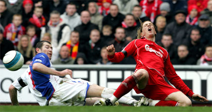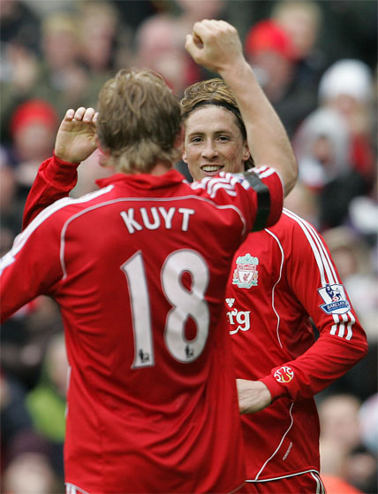Torres volvió a brillar ante su afición. A pesar de que sufrió un férreo marcaje por parte del defensor Samba, peleó en busca del gol durante todo el partido hasta que obtuvo recompensa. Fue el el 82’ cuando remató de cabeza un centro de Gerrard desde la derecha dando lugar a su vigésima segunda diana en la Premier. A cinco minutos para el final fue relevado por Voronin y homenajeado una vez más por una afición entregada. Steven Gerrard abrió la cuenta local y Voronin la cerró, mientras que Santa Cruz marcó el único gol de su equipo cumplido el tiempo reglamentario.