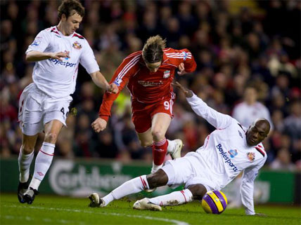 El Liverpool consiguió ante el Sunderland su primera victoria del 2008 en Liga (3-0) y sumó tres puntos muy importantes que lo devuelven a la lucha por la ‘zona Champions’. Fernando Torres colaboró anotando el segundo gol, el decimoctavo de la temporada (doce en la Premier), y se consagra como máximo goleador del equipo. Con este triunfo los hombres de Rafa Benítez se sitúan a solo un punto de la cuarta plaza que ocupa el Everton. Además, los ‘reds’ cuentan aún con una jornada disputada menos que sus vecinos de Merseyside.Fernando Torres salió de inicio compartiendo delantera con Peter Crouch. El ‘9’ sufrió en la primera mitad para penetrar en el perímetro defensivo que planteó el Sunderland, si bien en el segundo tiempo, tras iniciar la jugada que dio lugar al primer gol, supo sacar partido a los espacios que cedió la defensa para sentenciar el choque. Los otros dos goles de la tarde fueron obra de Crouch, que abrió el marcador, y el capitán Steven Gerrard.