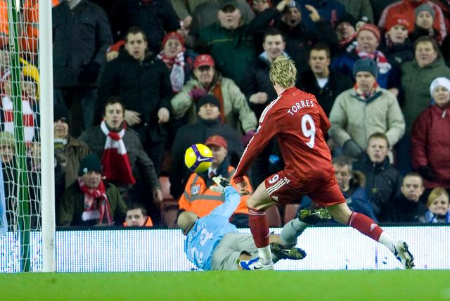 Torres busca el gol ante Howard (Foto: www.liverpoolfc.tv)En la primera mitad el derbi permaneció fiel a su identidad con ritmo intenso y mucha, mucha velocidad en la transición del cuero. Tampoco faltó a la cita el contacto físico que tanto ha marcado la historia de los derbis de Merseyside. La pelota no encontraba dueño, pero el Liverpool demostró su carácter táctico trabajado por Benítez buscando la apertura hacia bandas o el balón en profundidad. El Everton optó por un fútbol directo cimentado fundamentalmente en balones bombeados o disparos desde fuera del área, como el del nigeriano Anichebe en los primeros compases.